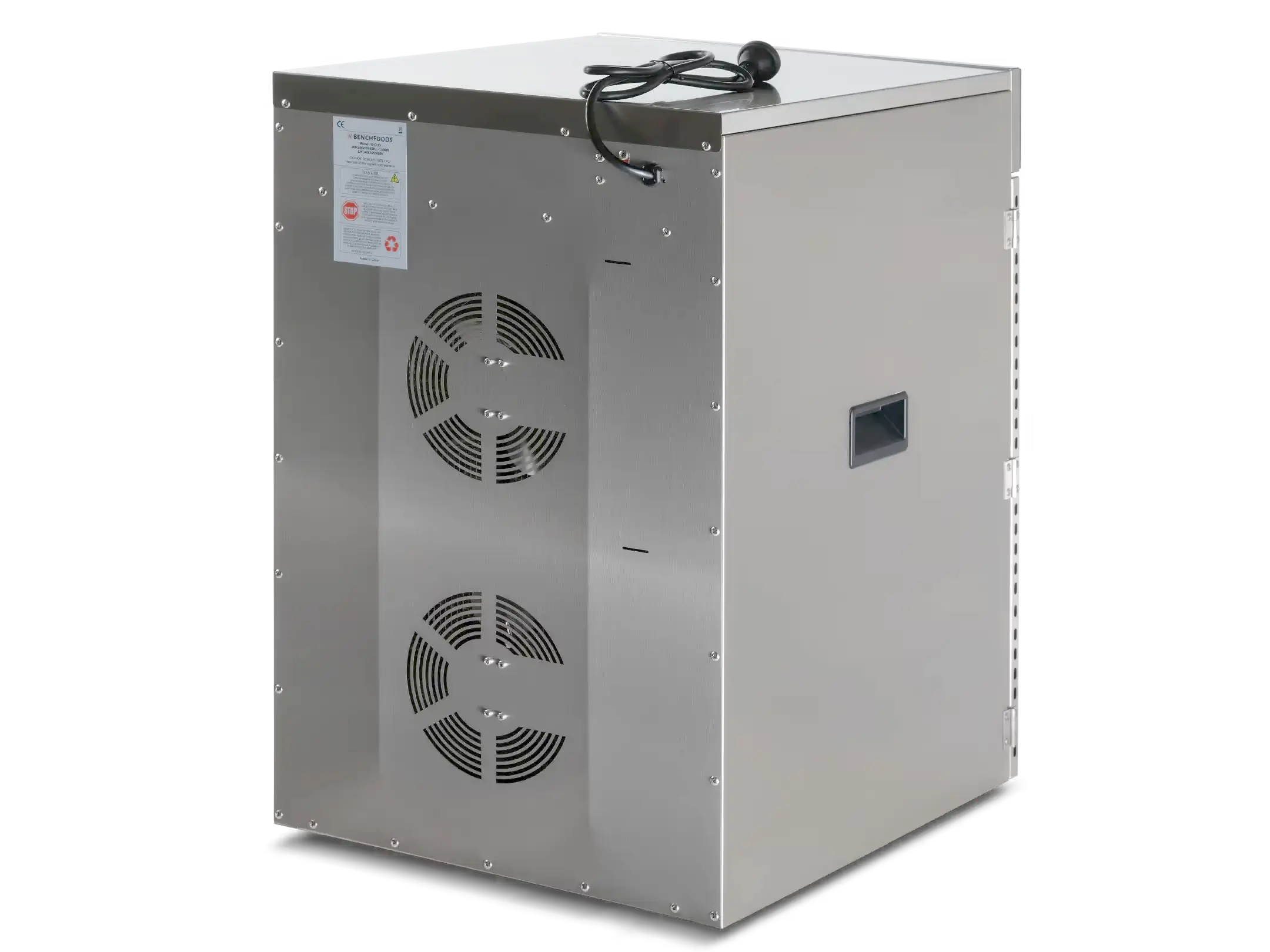 BenchFoods 1-zone 16-tray NSF and CSA certified stainless steel dehydrator with tempered glass door and biltong hanging on hooks