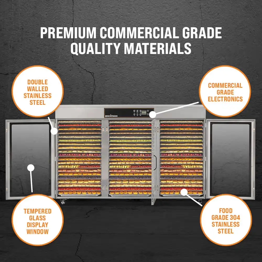 Our Industrial Dehydrators are constructed with the highest quality 304 Food-Grade Stainless Steel available. This stainless steel grade contains higher levels of chromium and nickel, which forms a protective layer on the surface, preventing corrosion (rust), and preventing the formation of bacteria and other microorganisms. Additionally, it’s non-reactive and won’t react with acidic or alkaline substances found in food and cleaning agents. This steel is also very easy to clean and sanitize, which is essential in food production facilities. In summary, using food-grade stainless steel ensures food safety and hygiene by preventing contamination and maintaining the quality of the food being processed.