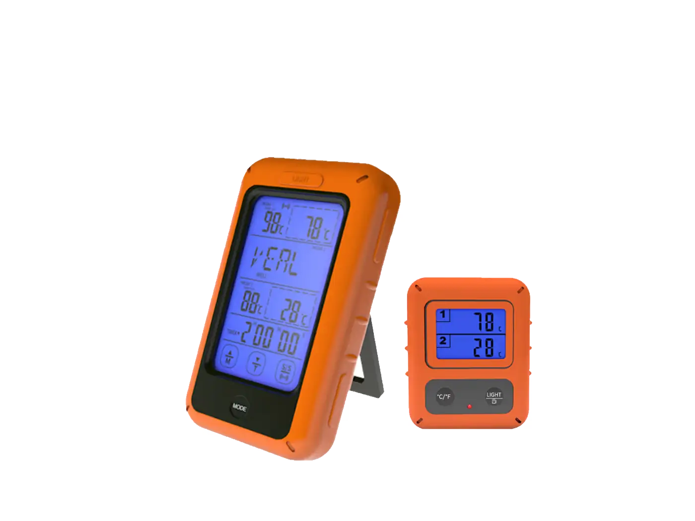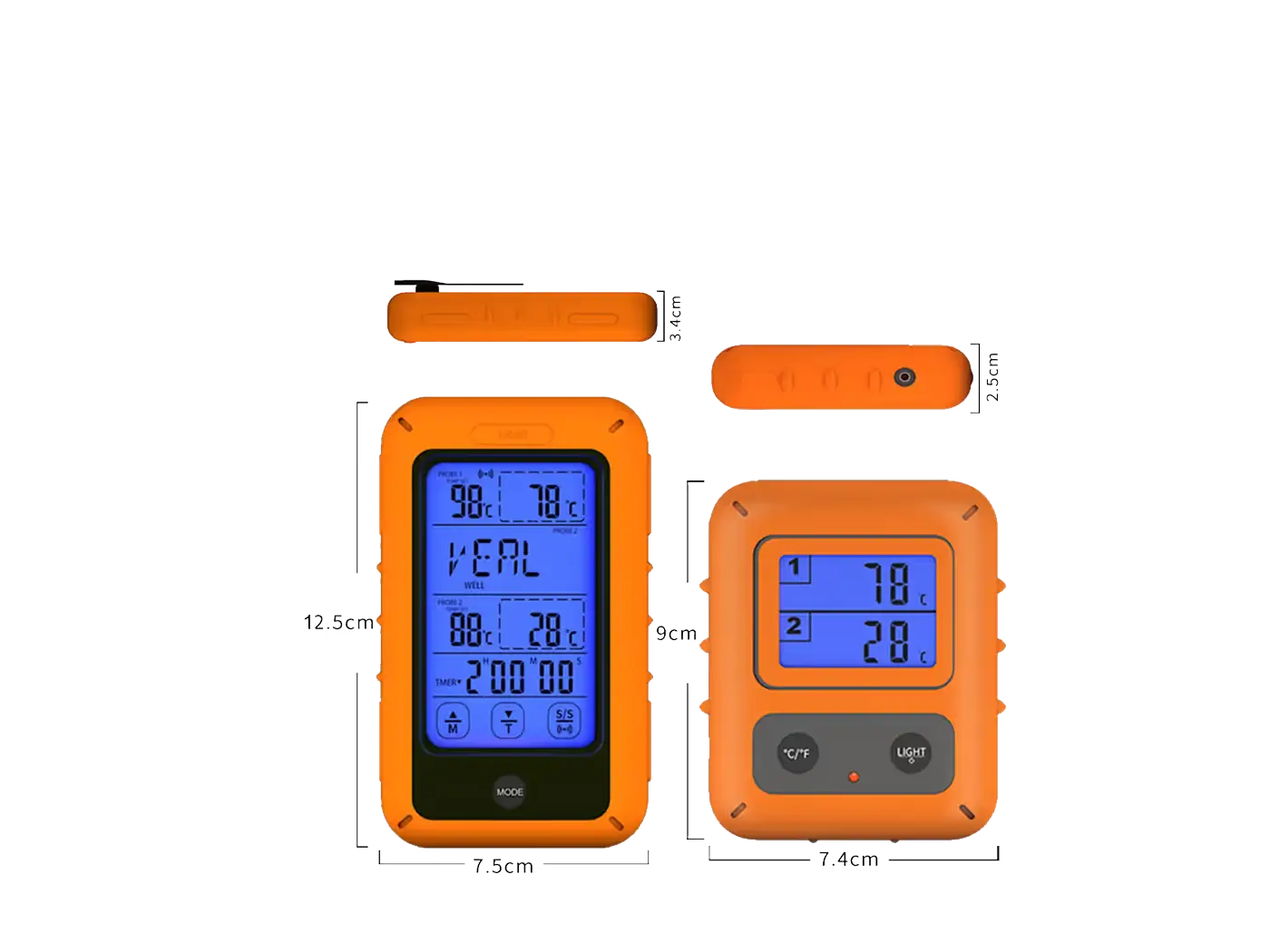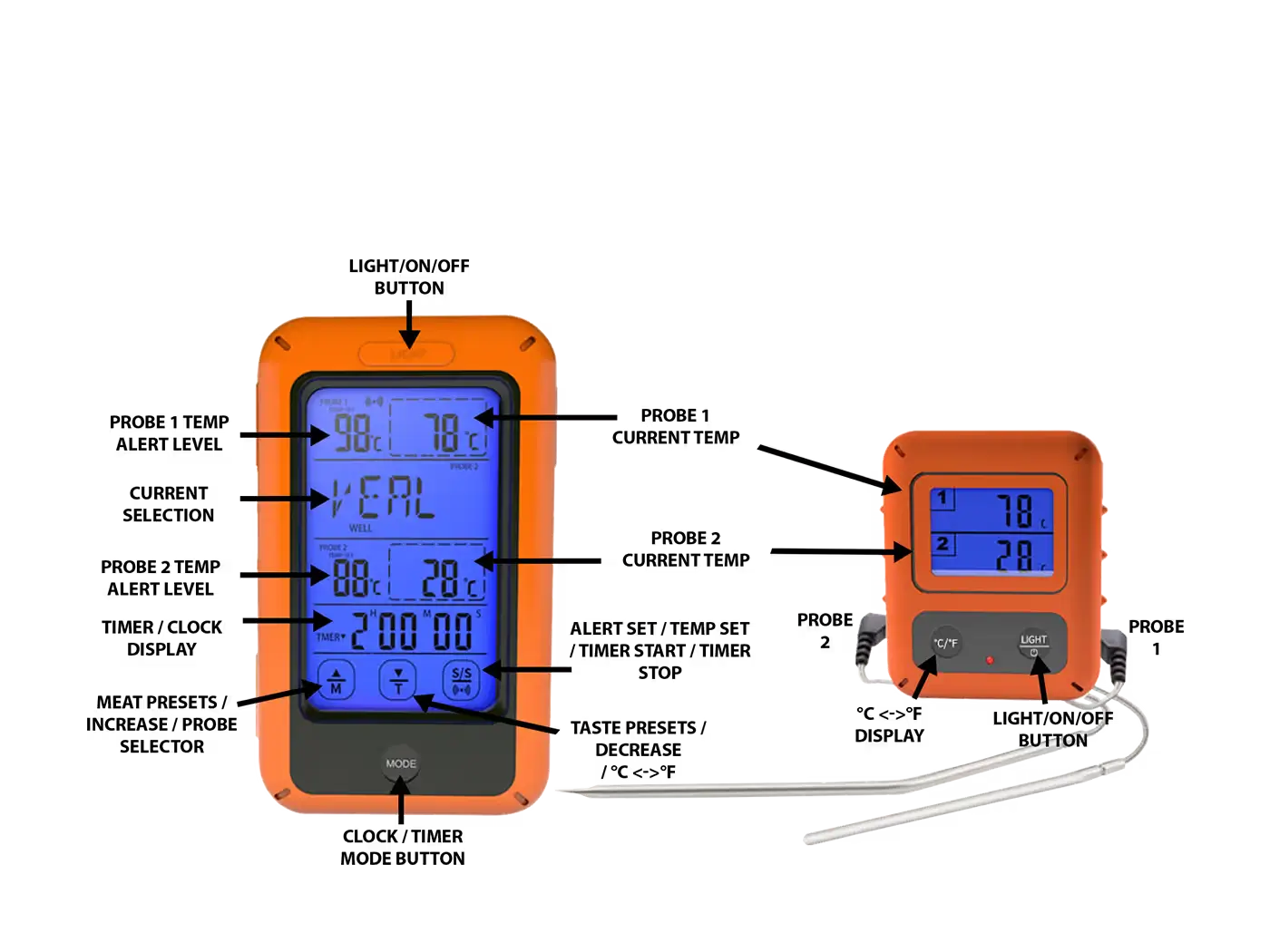 Product Description TP-20 Temperature Probe with blue backlit keyboard, dual stainless steel probes and silicone easy-grip sleeve. Temperature alarms and count-down timer alert functionality. Pre-programmed with ideal temperature levels for most types of meat including; beef, lamb, veal, pork, turkey, chicken, fish or choose your own.